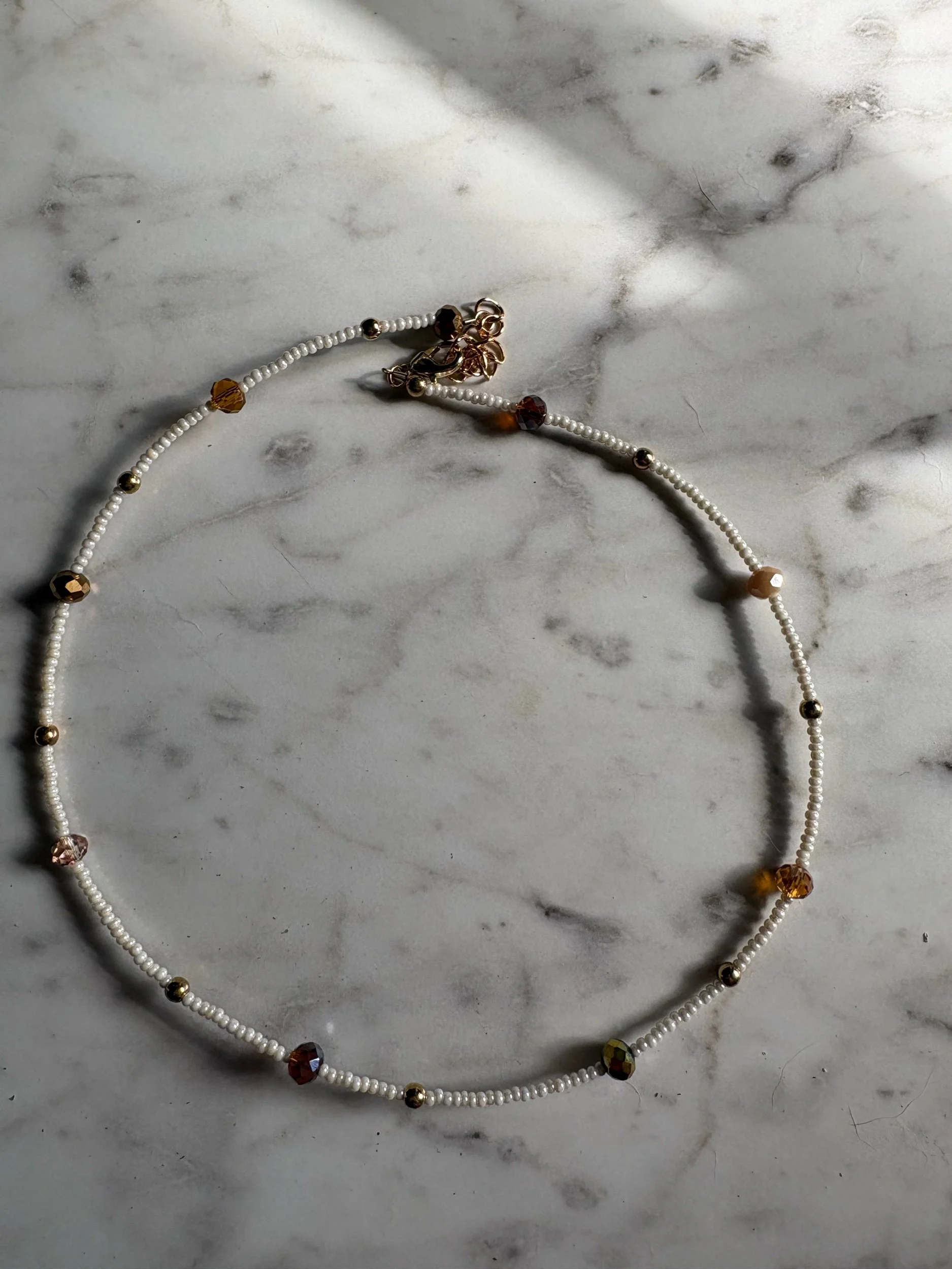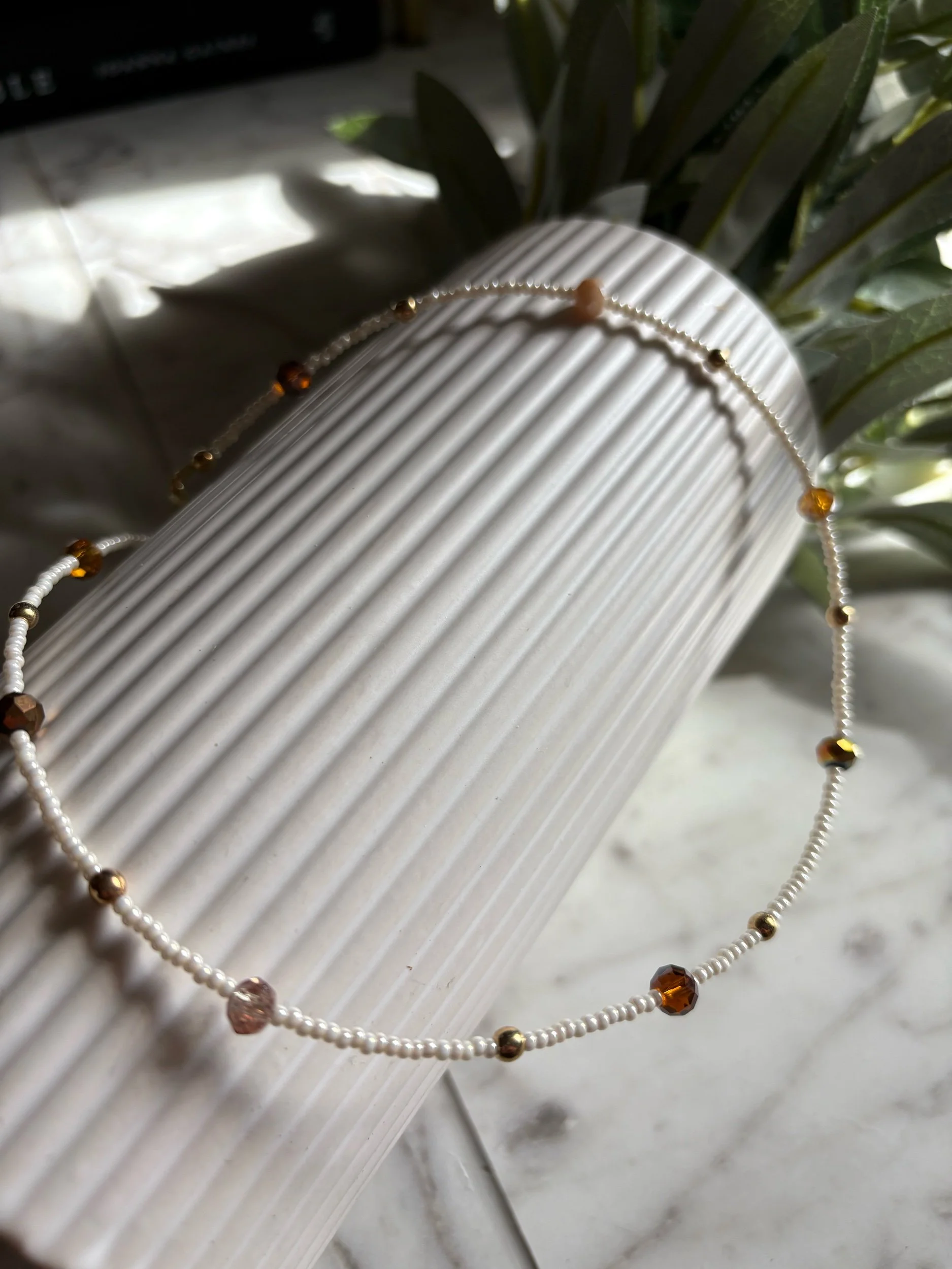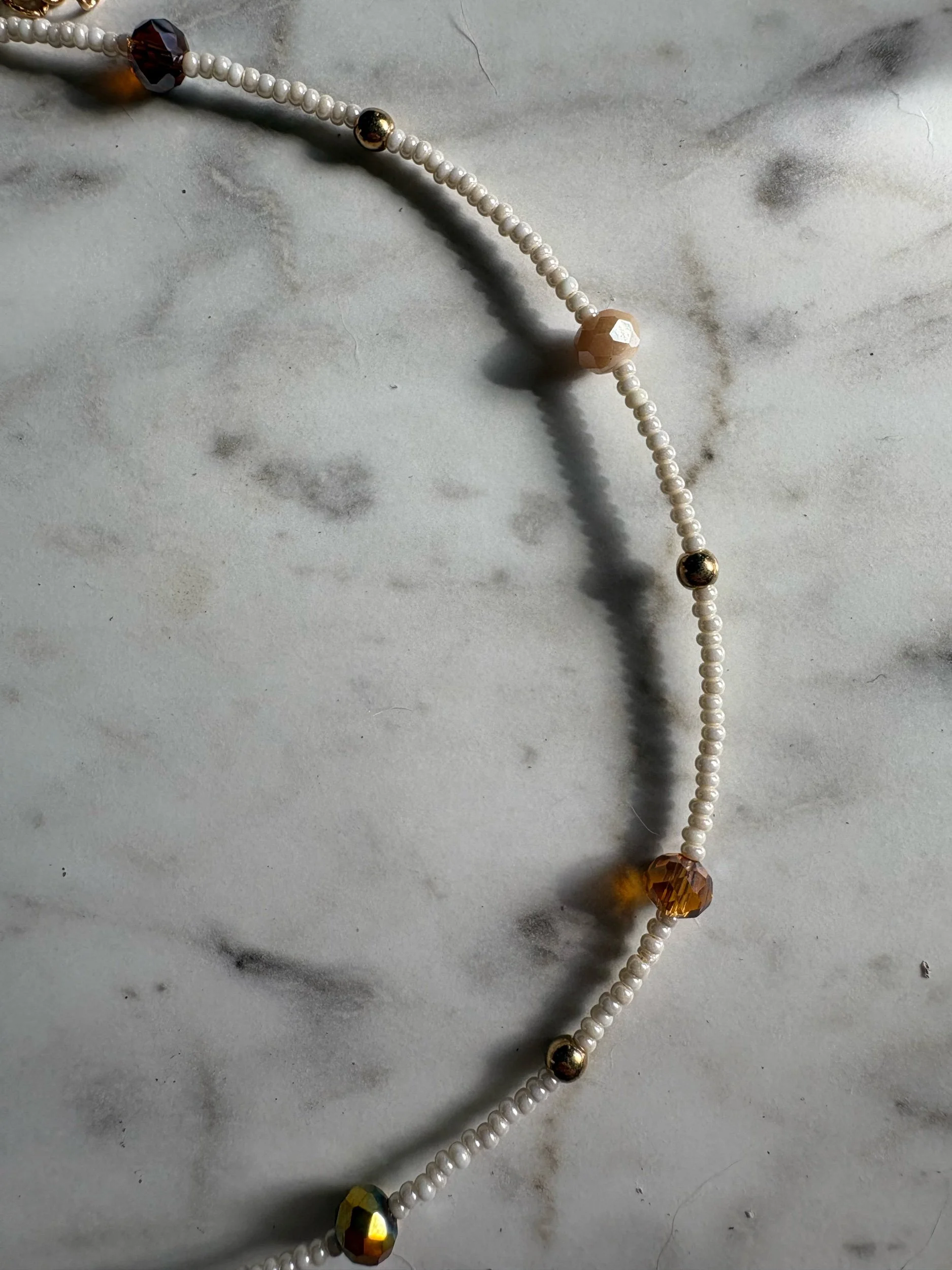 This necklace is made with seed beads with neutral beads added.