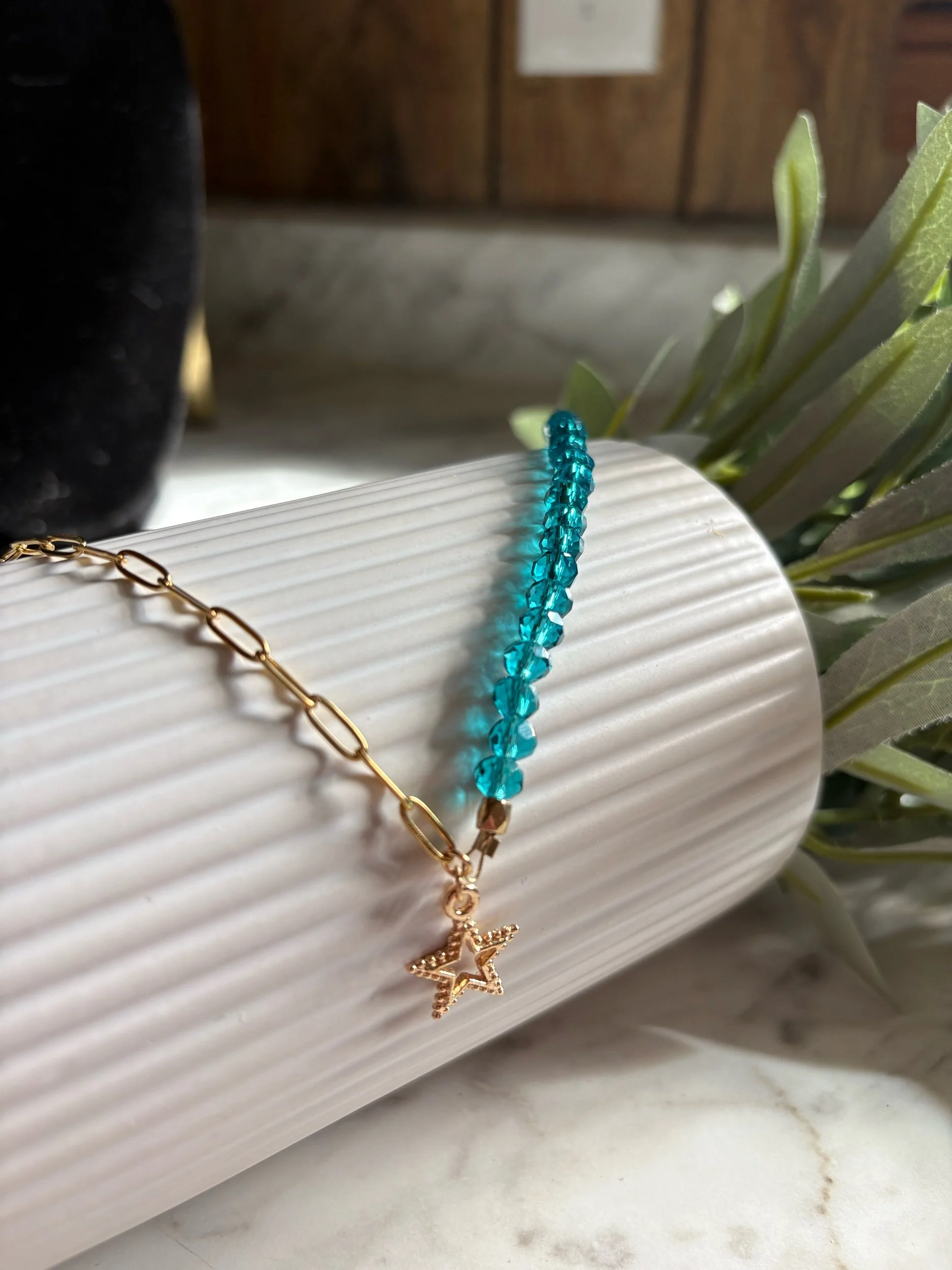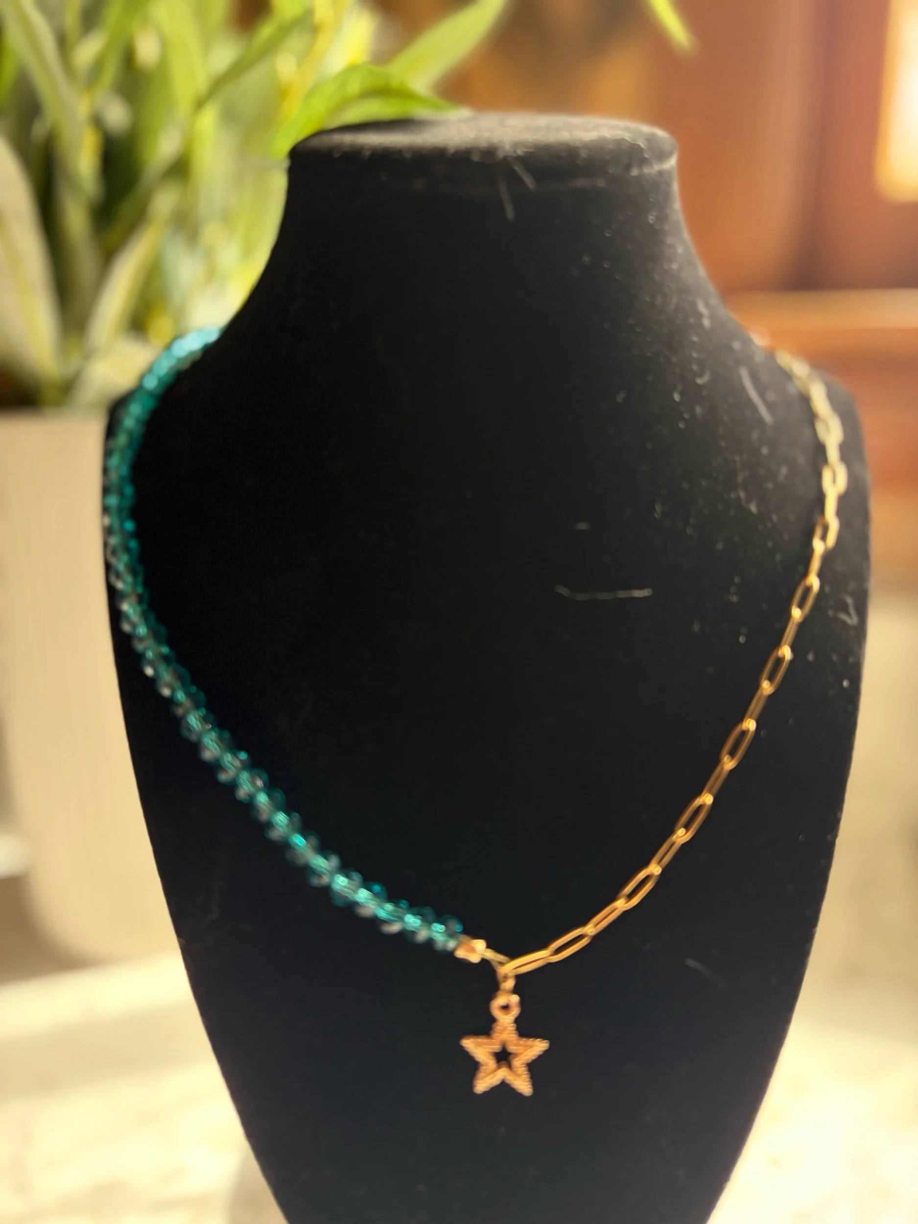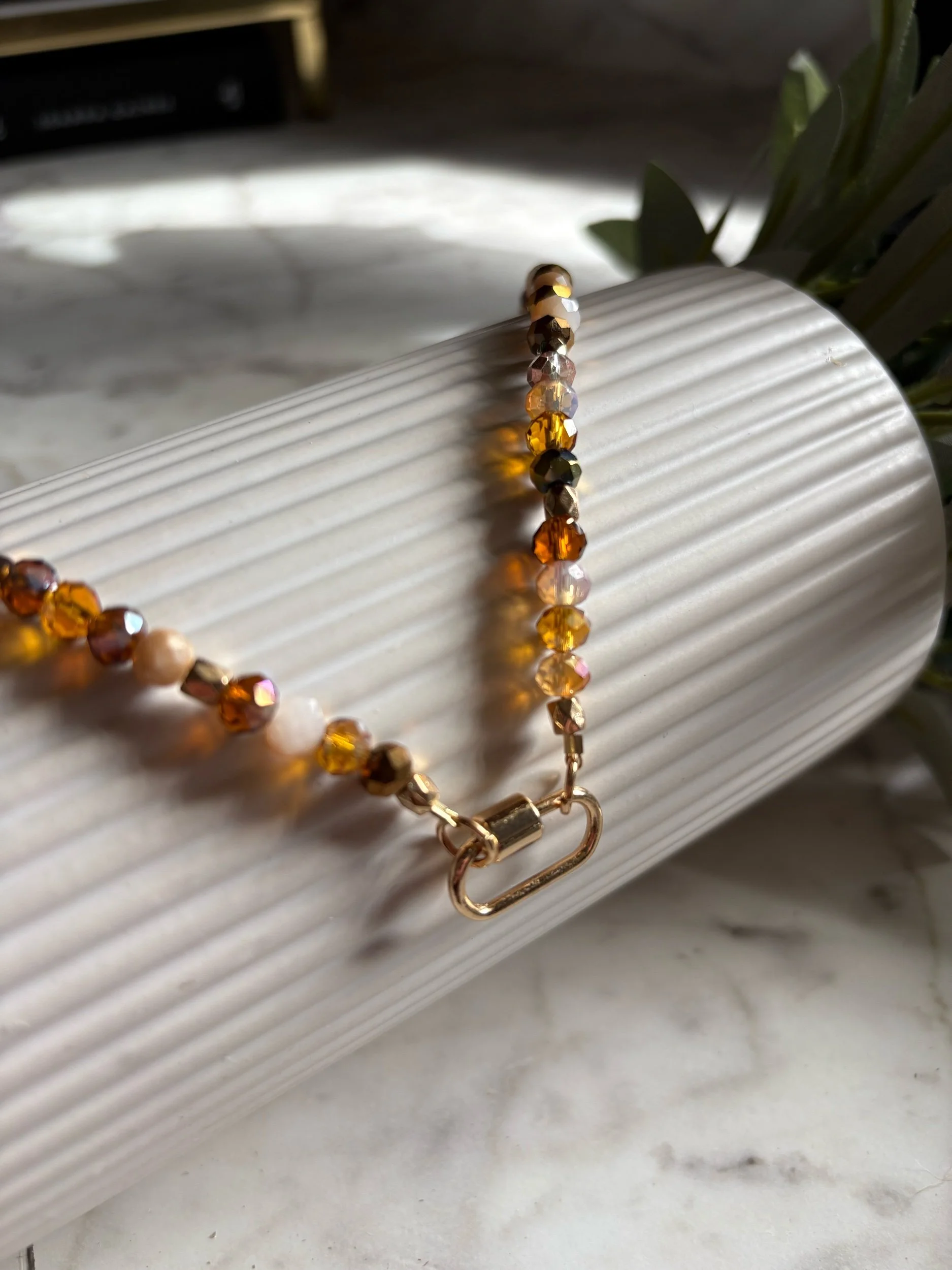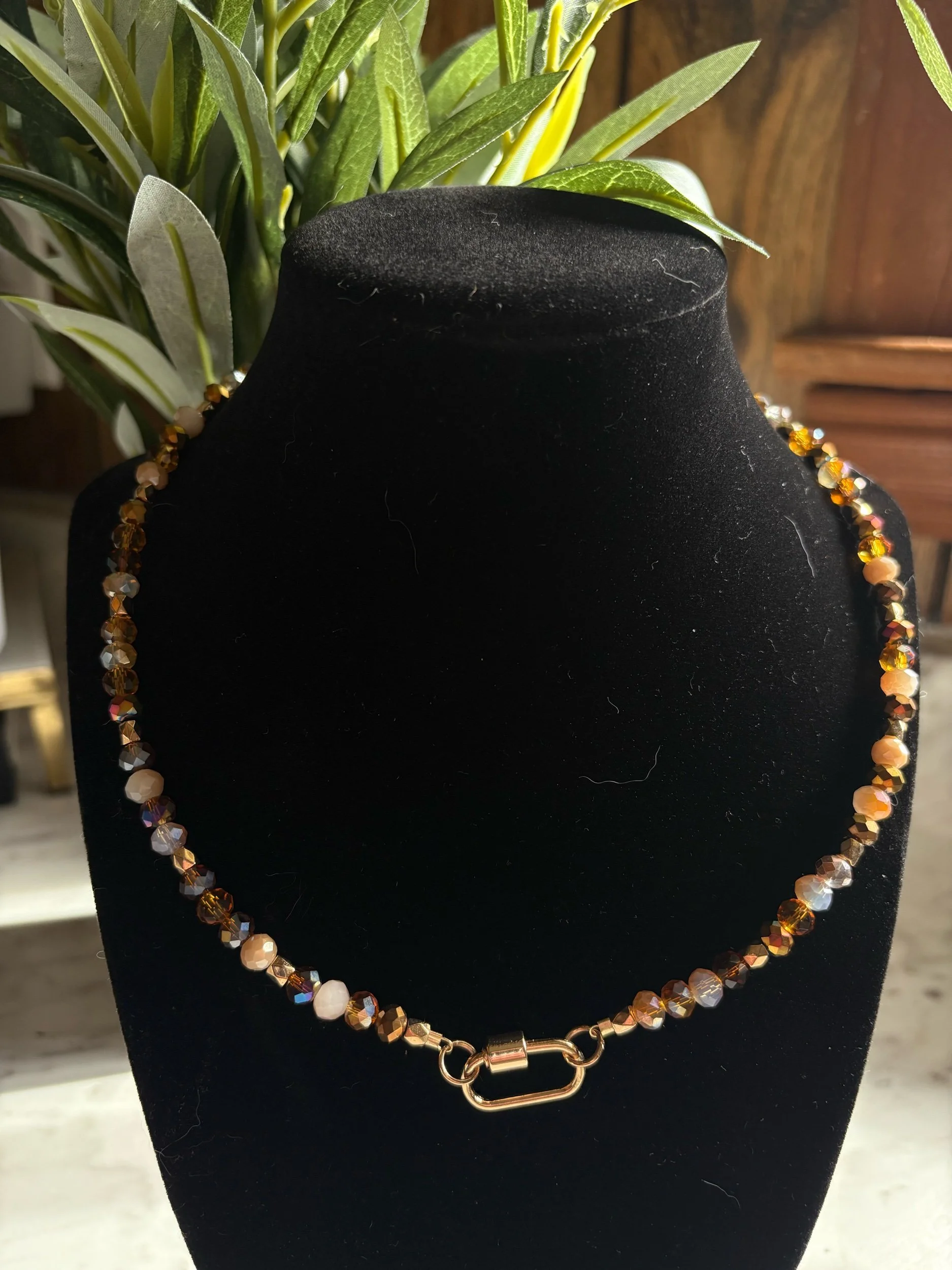 This necklace is made with seed beads with neutral beads added.