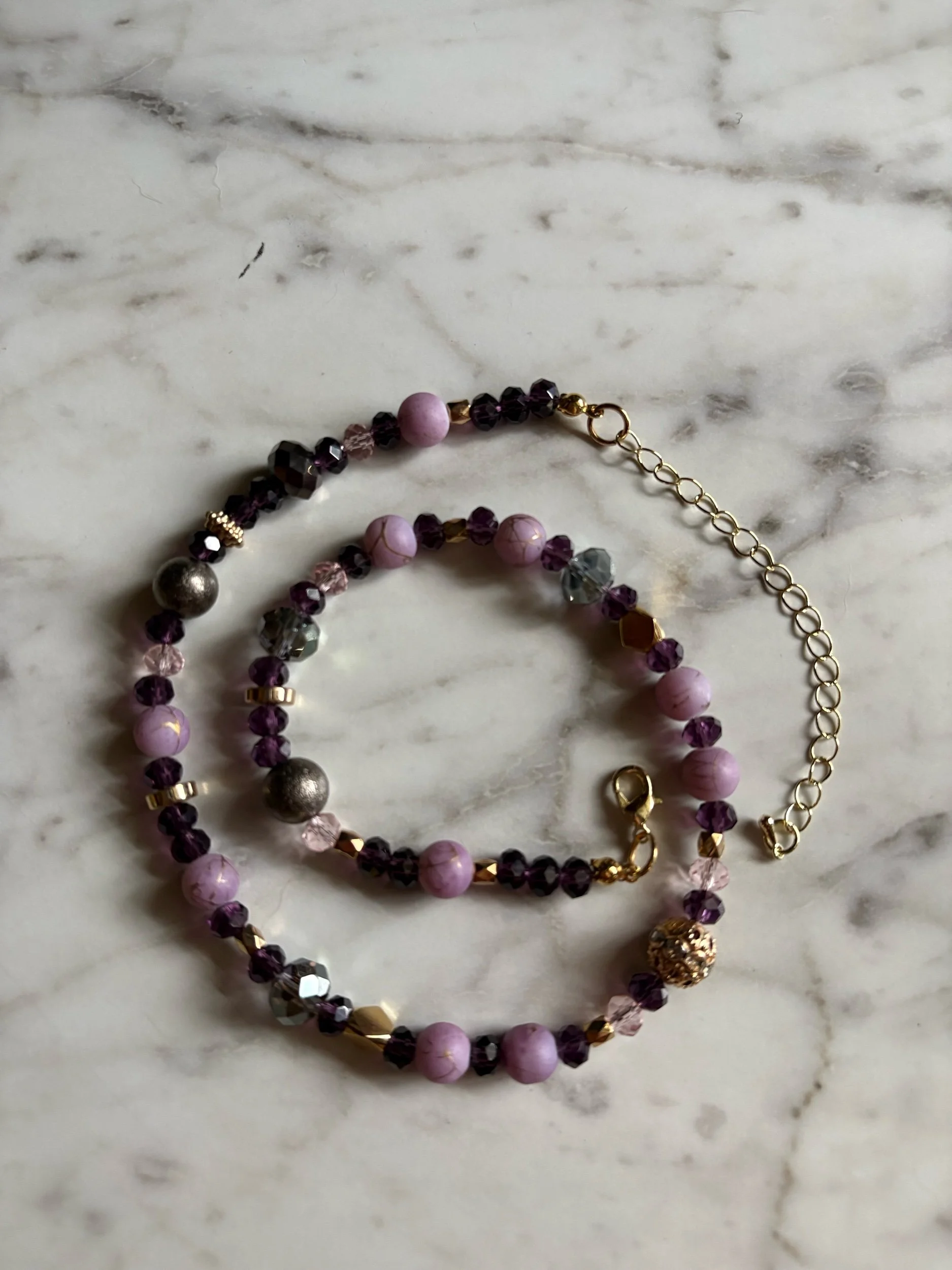 Made with purple glass and acrylic purple beads in addition to a few silver and gold colored beads throughout.