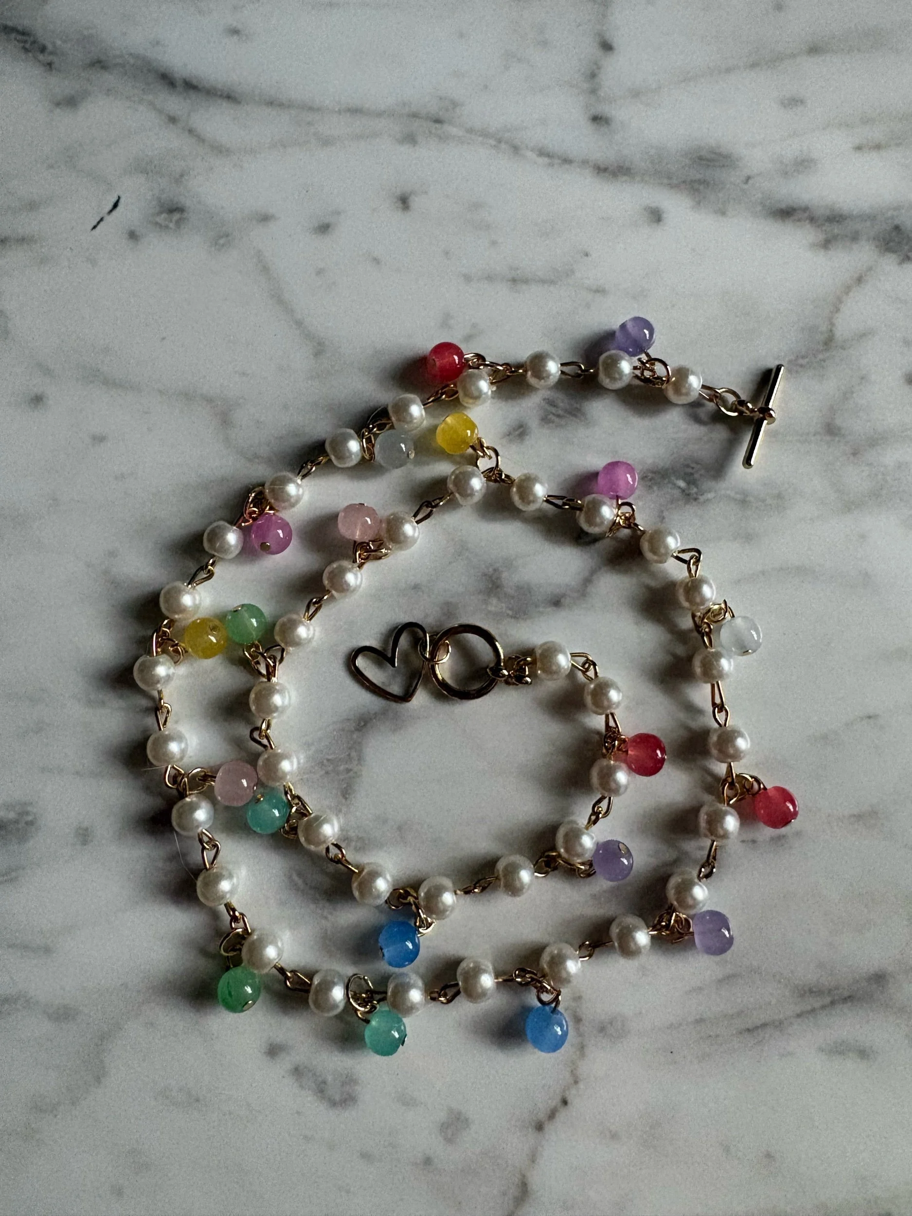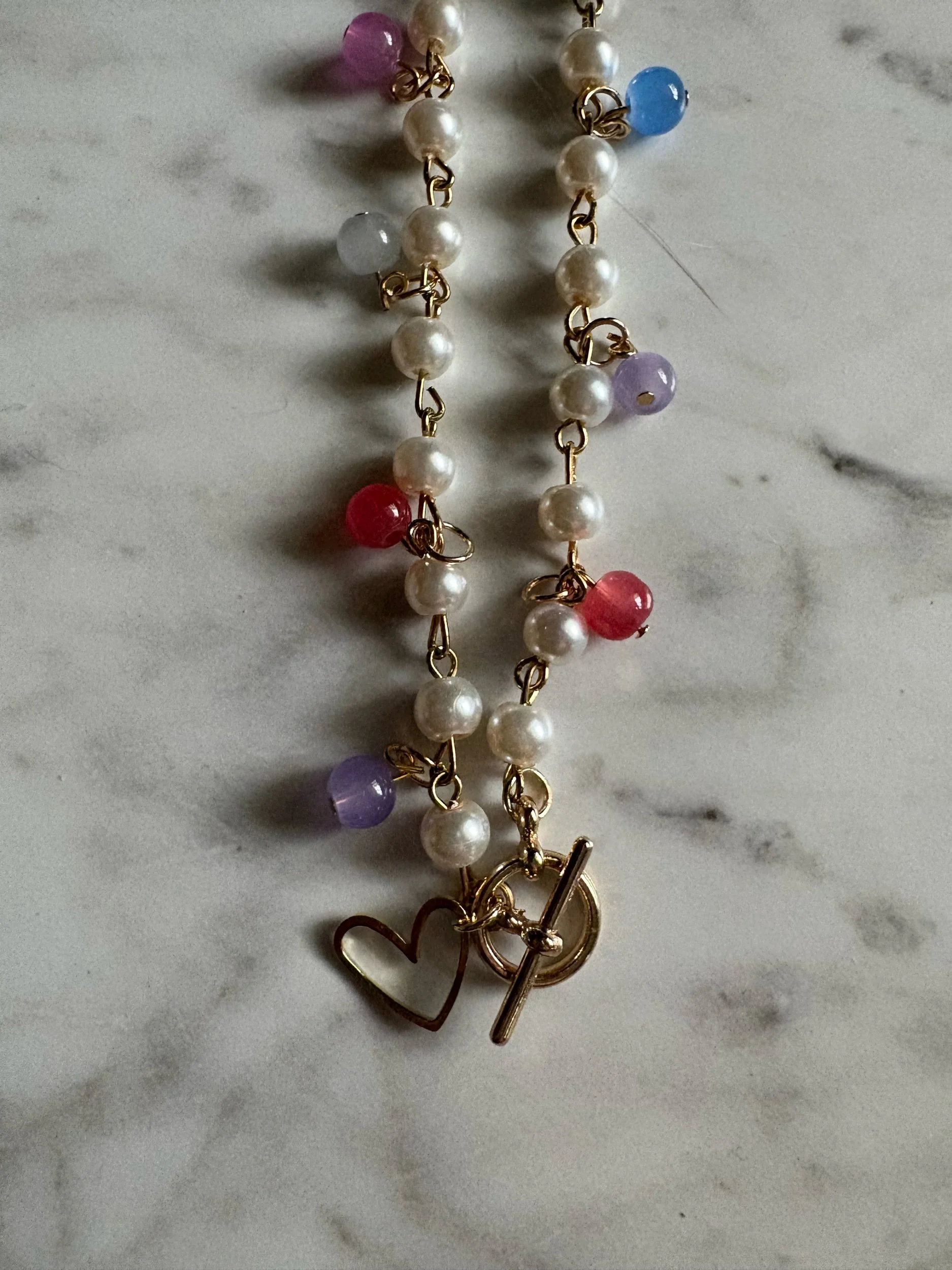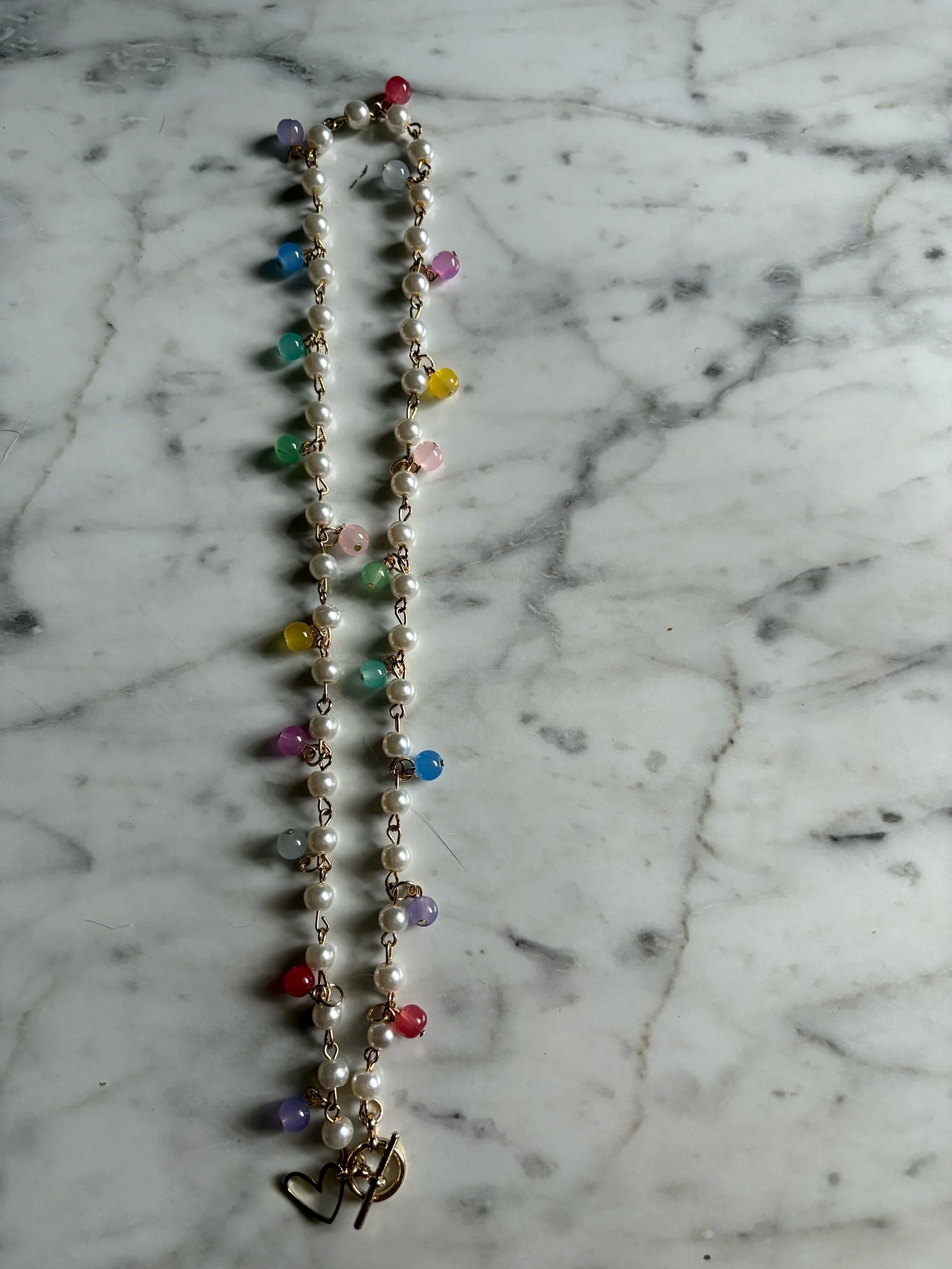 Made with a pearl chain with glass beads added in addition to a metal heart charm.